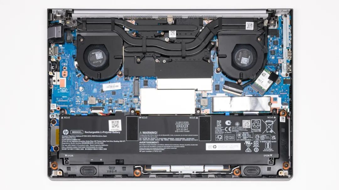 上图是惠普 战99 锐龙独显版的拆机实拍图,三热管双风扇的组合。