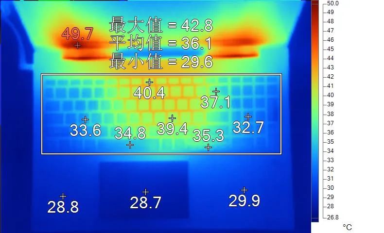 表面温度如上图所示,键盘键帽最高40.4℃出现在功能键“F8”键上,WASD键附近约为33.6℃,方向键35.3℃。左腕托温度为28.8℃。