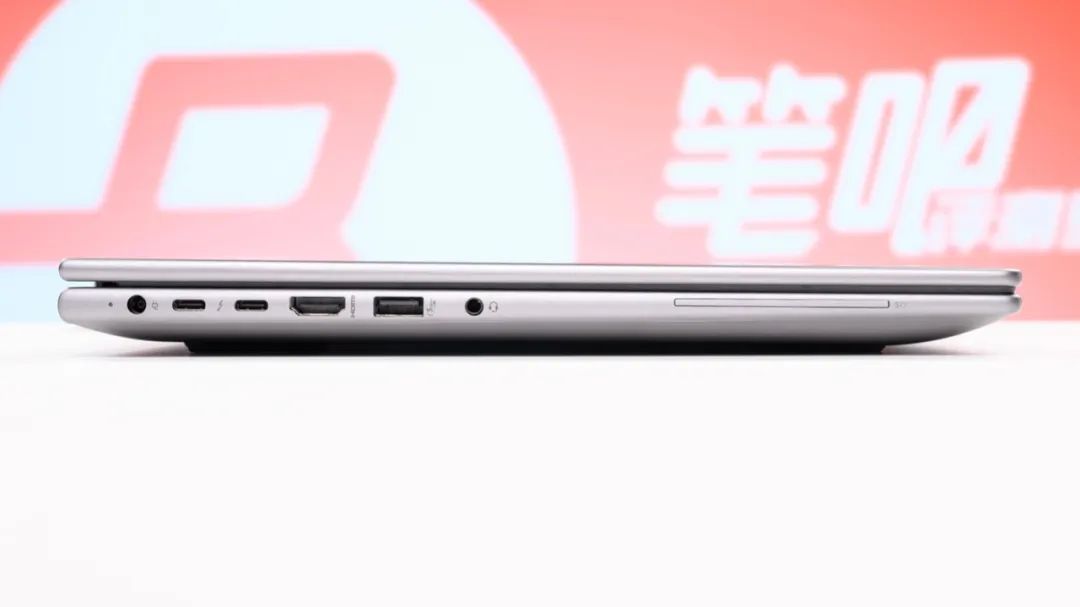接口方面,机身左侧依次为电源接口、两个雷电4(均支持100W PD充电与DP1.4核显输出)、HDMI2.1(核显输出)、USB-A 10Gbps和3.5mm音频接口;