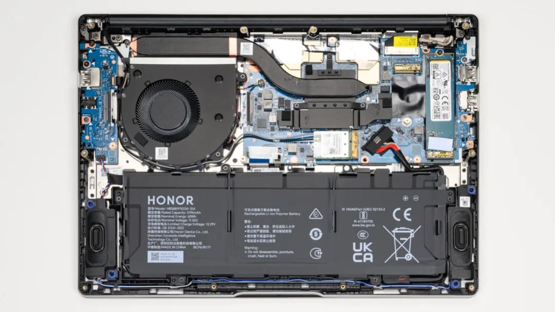 上图是荣耀笔记本 X14 锐龙版的拆机实拍图,单风扇单热管的组合。