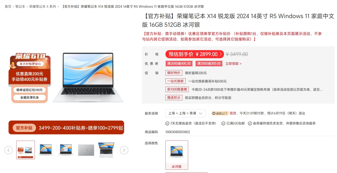 荣耀笔记本 X14 锐龙版在官网上就卖2899元,此外PDD也有相同的价格销售。