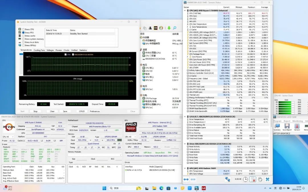 在满载状态下,开启高能模式,CPU温度最高100.1℃,稳定在95.5℃,功耗40W,频率维持在4.0GHz左右。
