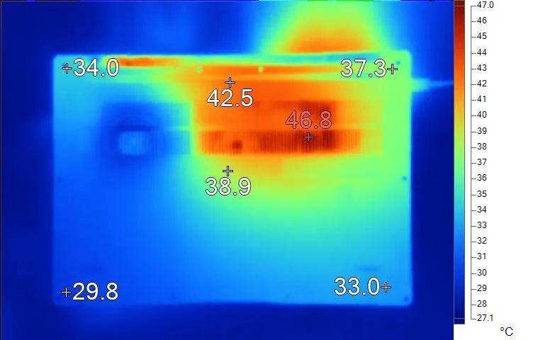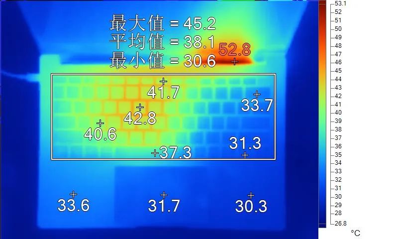 表面温度如上图所示,键盘键帽最高41.7℃出现在键盘“T”键上,WASD键为40.6℃,方向键31.3℃。左腕托温度为33.6℃,背面中心点38.9℃。