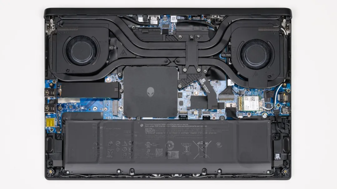 上图是ALIENWARE m16 R2 青春版的拆机实拍图,四热管双风扇的组合。