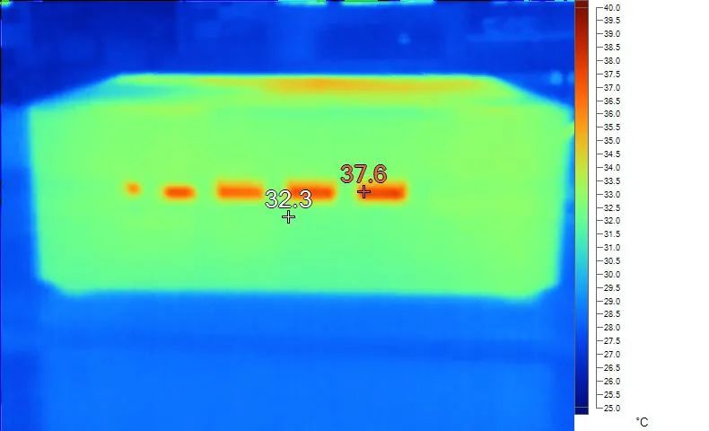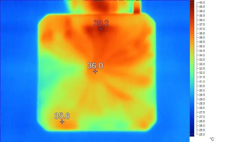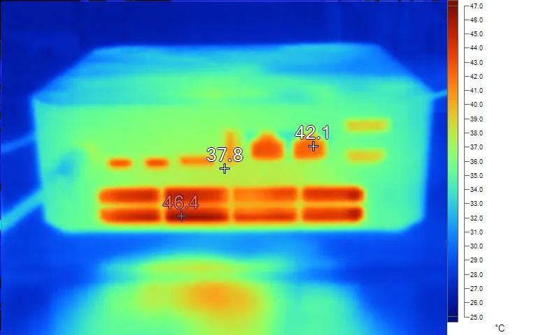 机身表面温度如上图所示,上方最热点为39.2℃,中心位置为36.0℃;机身正面最热点为37.6℃,中心位置为32.3℃;机身背面最热点为46.4℃(散热鳍片处),中心位置为37.8℃。
