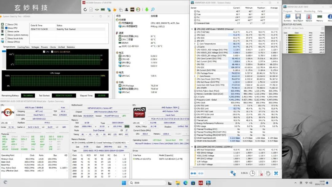 在满载状态下,开启狂暴模式,CPU温度稳定在91.8℃,功耗80W,核心频率维持在4.4GHz。