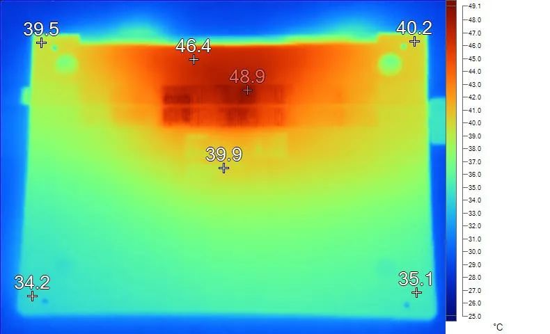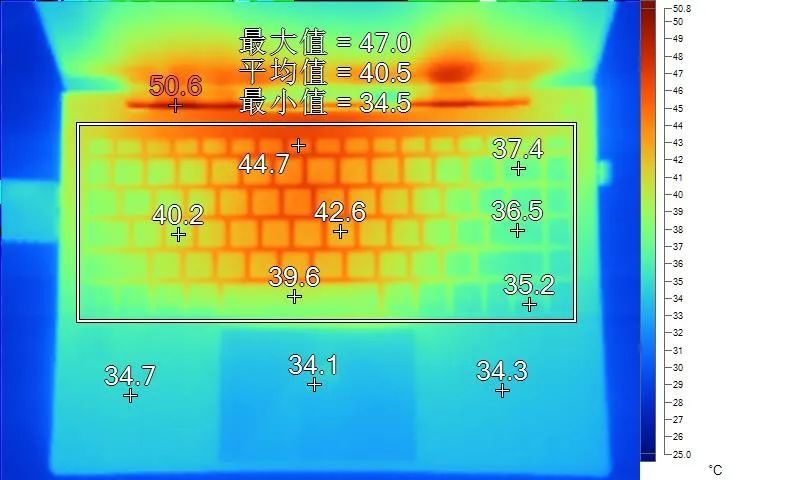 表面温度如上图所示,键盘键帽最高温44.7℃出现在“F7”键上,WASD键附近约为40.2℃,方向键35.2℃。左腕托温度为34.7℃,背面中心点39.9℃。