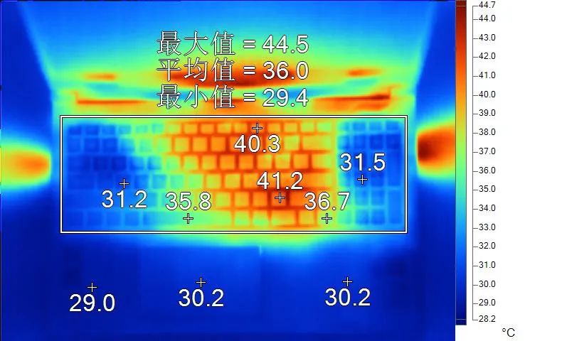 表面温度如上图所示,键盘键帽最高温41.2℃出现在“?”键上,WASD键附近约为31.2℃,方向键36.7℃。左腕托温度为29.0℃。