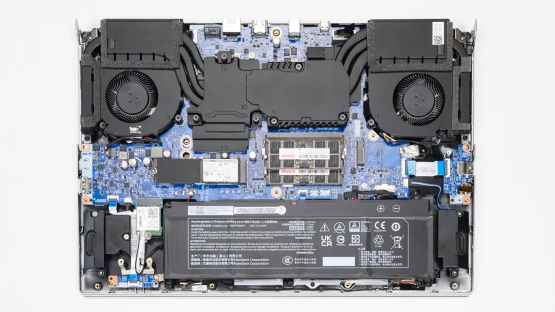 上图是机械师 曙光15Pro 锐龙版的拆机实拍图,五热管双风扇的组合。