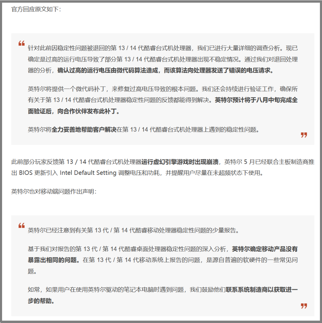 昨天Intel发布了声明,确认该问题由“微代码算法造成”,并预计将于八月中旬“提供一个微代码补丁来修复过高电压导致的根本问题”。