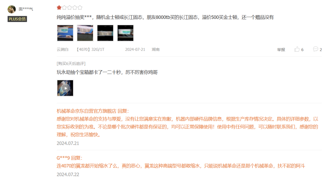 最近有一些消费者反馈自己购买的机械革命 翼龙15 Pro硬盘配置并非长江存储 PC411而是金士顿 OM8PGP41024N-A0。(如下图京东评价)