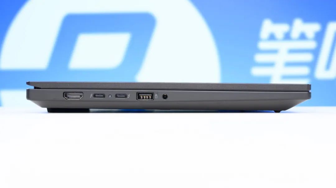 接口方面,机身左侧有两个雷电4(均支持最大135W充电和DP1.4核显视频输出)、一个USB-A 5Gbps、HDMI2.0和3.5mm耳麦接口;