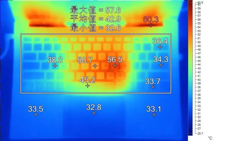 表面温度如上图所示,键盘键帽最高温56.5℃出现在“K”键上,WASD键附近约为38.0℃,方向键33.7℃。左腕托温度为33.5℃。背面中心点位42.4℃。