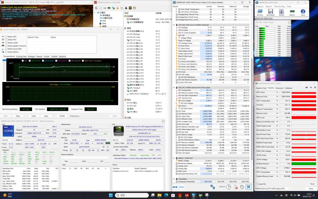 单烤Furmark,显卡温度维持在73℃,功耗75W,频率1560MHz。