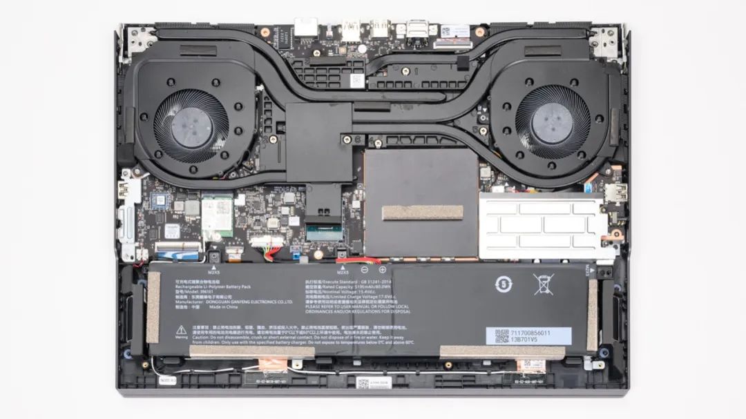 上图是机械师 曙光16的拆机实拍图,五热管双风扇的组合。