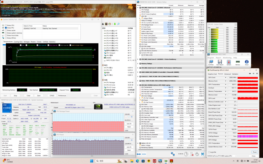在满载状态下,开启狂暴模式,CPU温度稳定在89℃,功耗55W,P核频率 2.9GHz,E核2.5GHz;