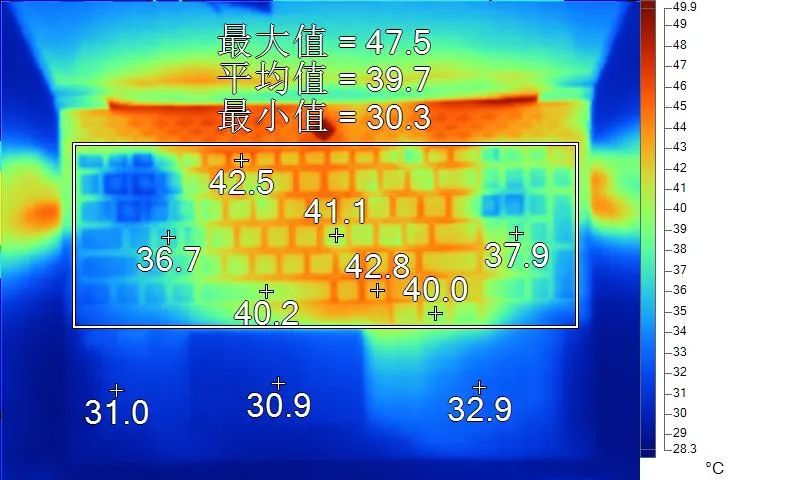 表面温度如上图所示,键盘键帽最高温42.8℃出现在右“Ctrl”键上,WASD键附近约为36.7℃,方向键40.0℃。左腕托温度为31.0℃。