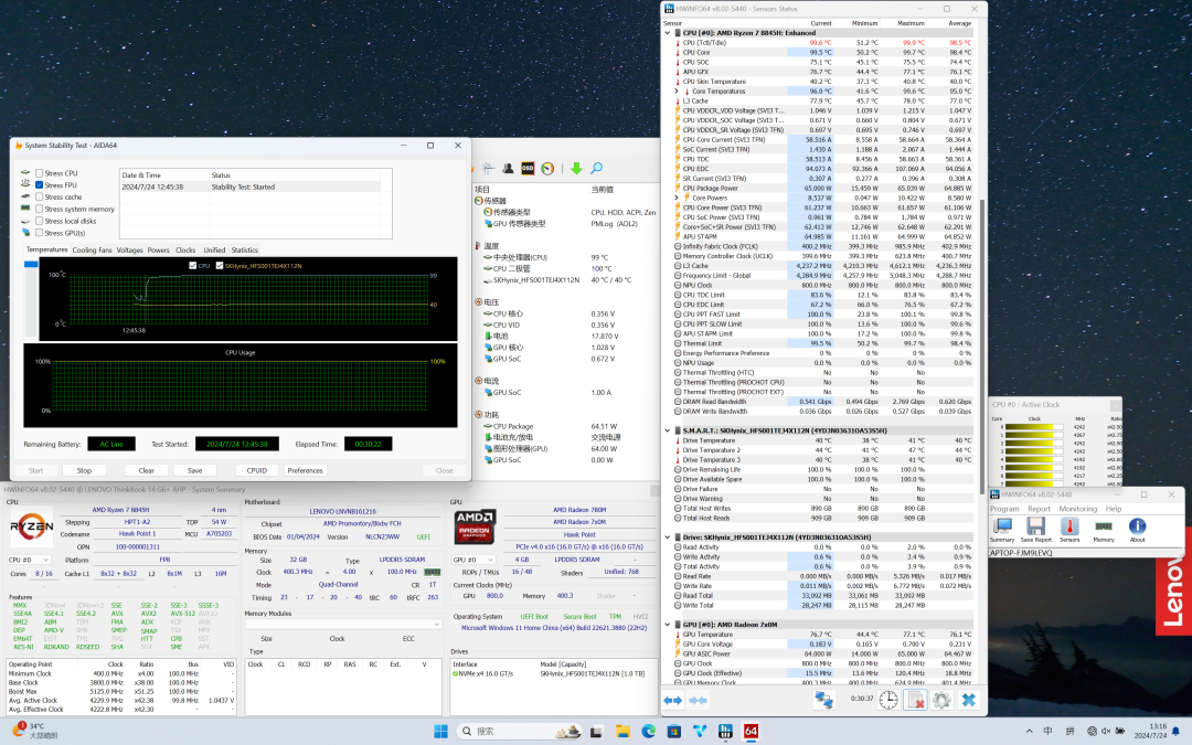 在满载状态下,开启极致模式,CPU温度稳定在94.5℃,功耗60W,频率维持在4.1GHz。
