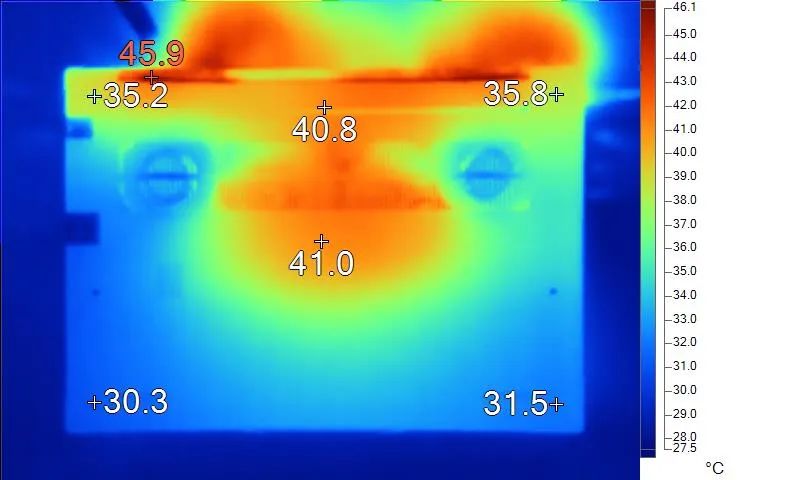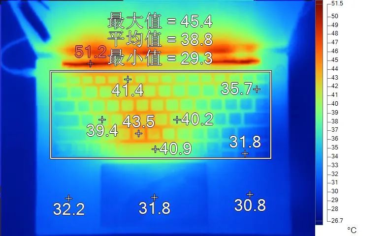 表面温度如上图所示,键盘键帽最高温43.5℃出现在“B”键上,WASD键为39.4℃,方向键31.6℃。左腕托温度为32.2℃,背面中心点41.0℃。