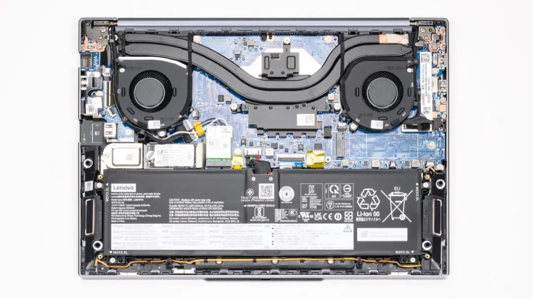 上图是联想ThinkBook 14+锐龙版的拆机实拍图,双风扇双热管的组合,和酷睿版一样为内吹的散热设计。