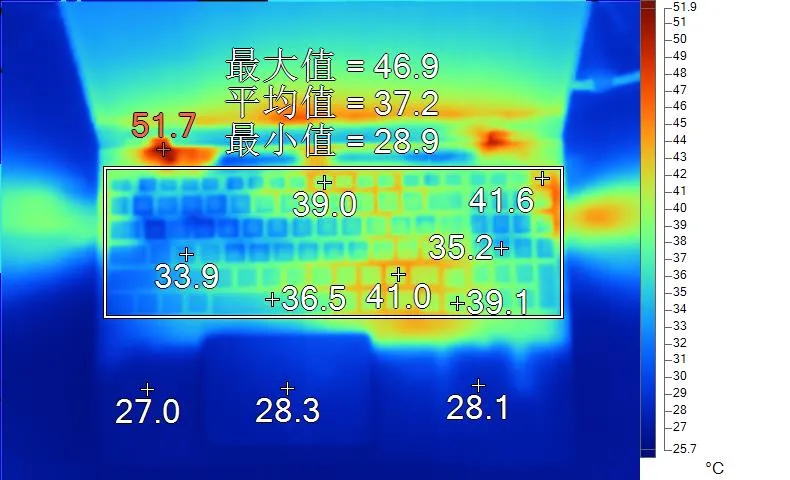 表面温度如上图所示,键盘键帽最高温41.6℃出现在键盘右上角上,WASD键附近约为33.9℃,方向键39.1℃。左腕托温度为27.0℃。