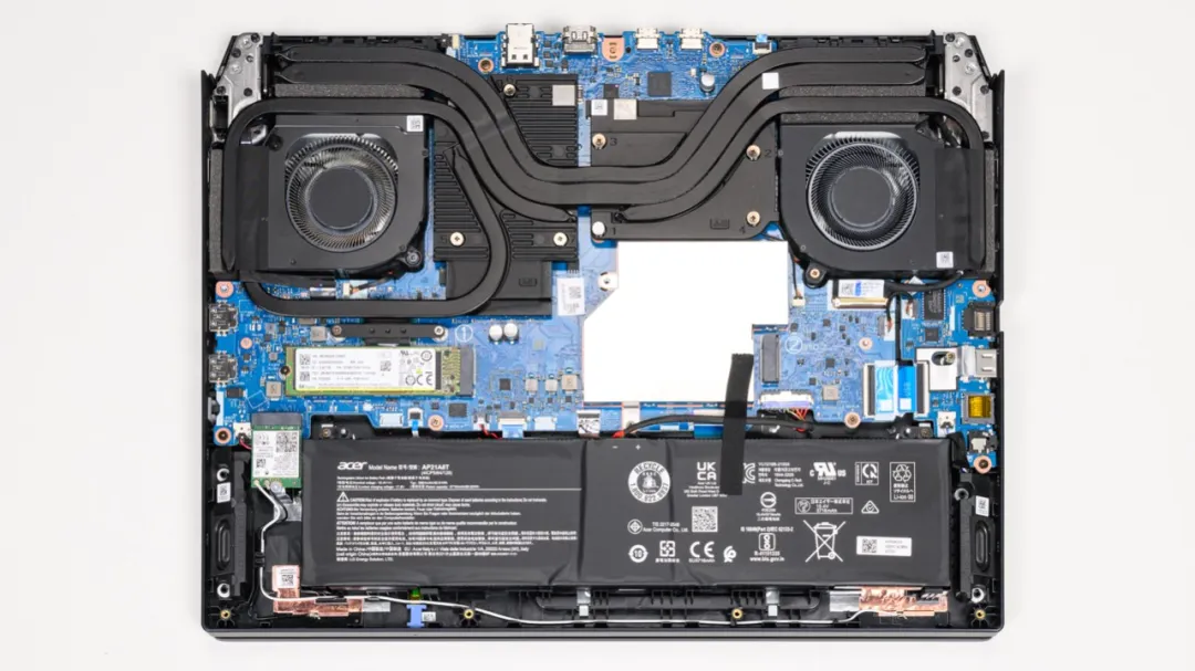 上图是宏碁 掠夺者·擎Neo的拆机实拍图,五热管双风扇双均热板加CPU液金的组合,其中一个是宏碁“刀锋”金属风扇。