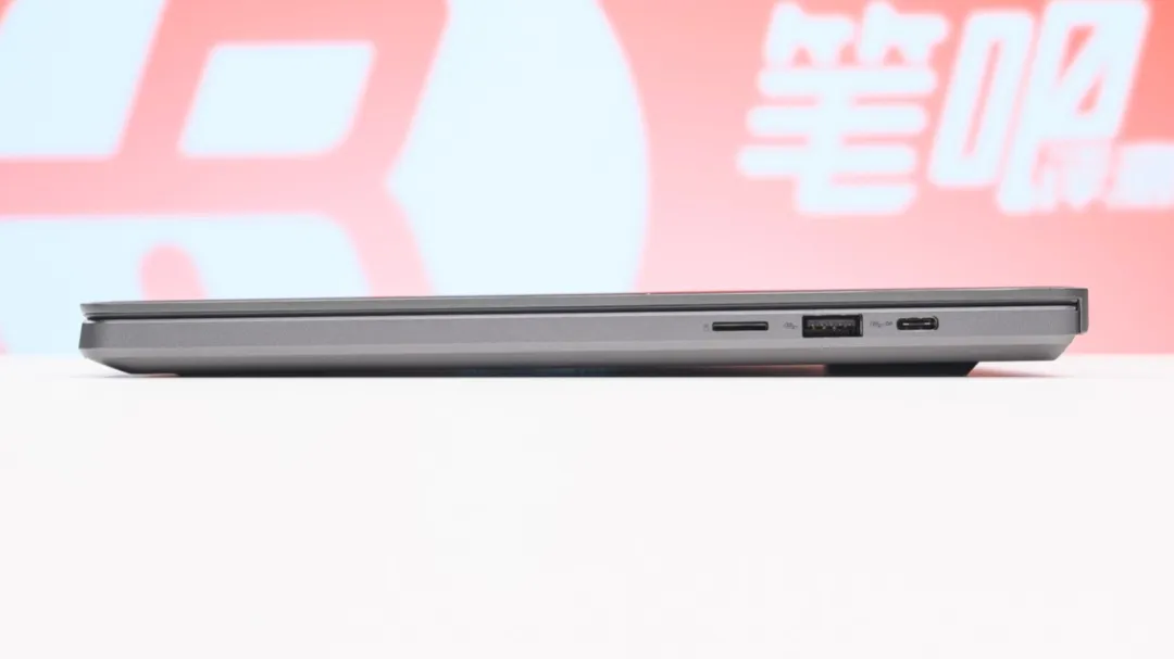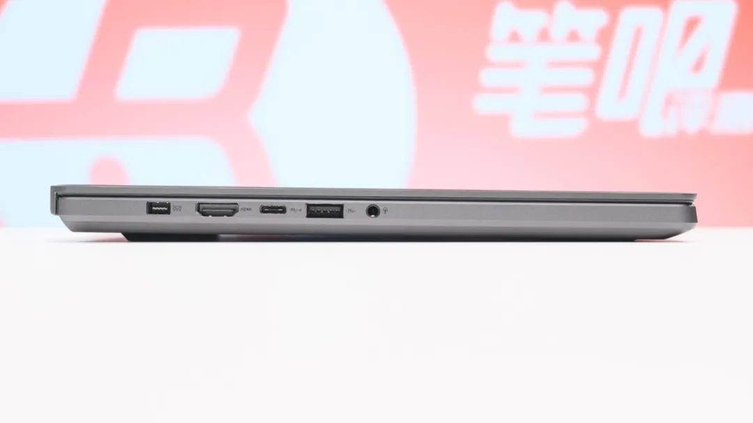 接口方面,机身左侧有DC电源口、HDMI 2.1(独显输出)、USB4(支持PD充电和DP集显视频输出)、USB-A 10Gbps,以及3.5mm音频接口;