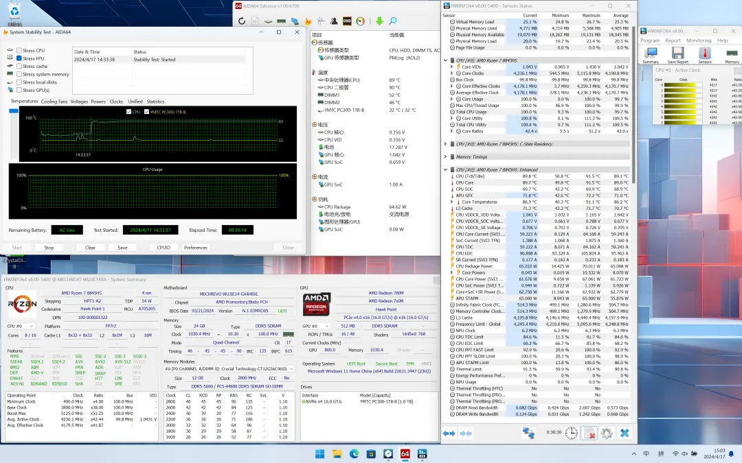 在满载状态下,开启狂暴模式,CPU温度最高91.5℃,稳定在89.8℃,功耗65W,频率在4.225~4.25GHz。