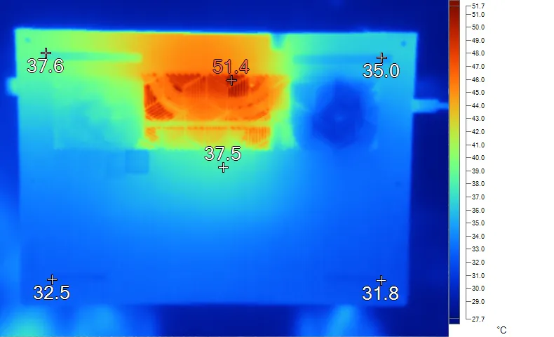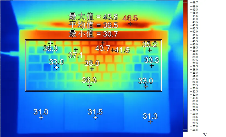 表面温度如上图所示,键盘键帽最高温43.7℃出现在F8键,WASD键为33.0℃,方向键33.0℃。左腕托温度为31.0℃,背面中心点37.5℃。