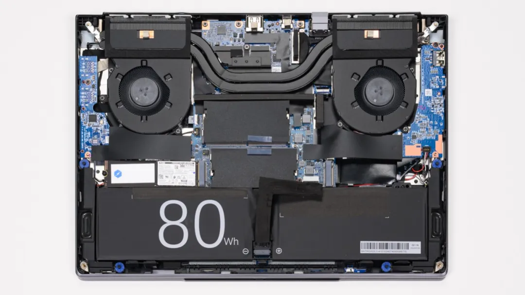 上图是机械革命 无界14X的拆机实拍图,双风扇双热管的组合,相比无界14Pro增加了热管与鳍片的有效换热面积,风扇也进行了更换。