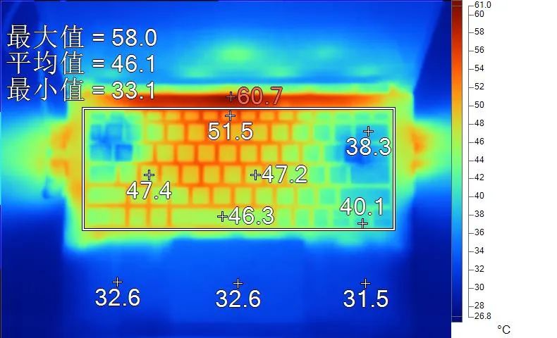表面温度如上图所示,键盘键帽最高温51.5℃出现在功能键“F7”键上,WASD键附近约为47.4℃,方向键40.1℃。左腕托温度为32.6℃。
