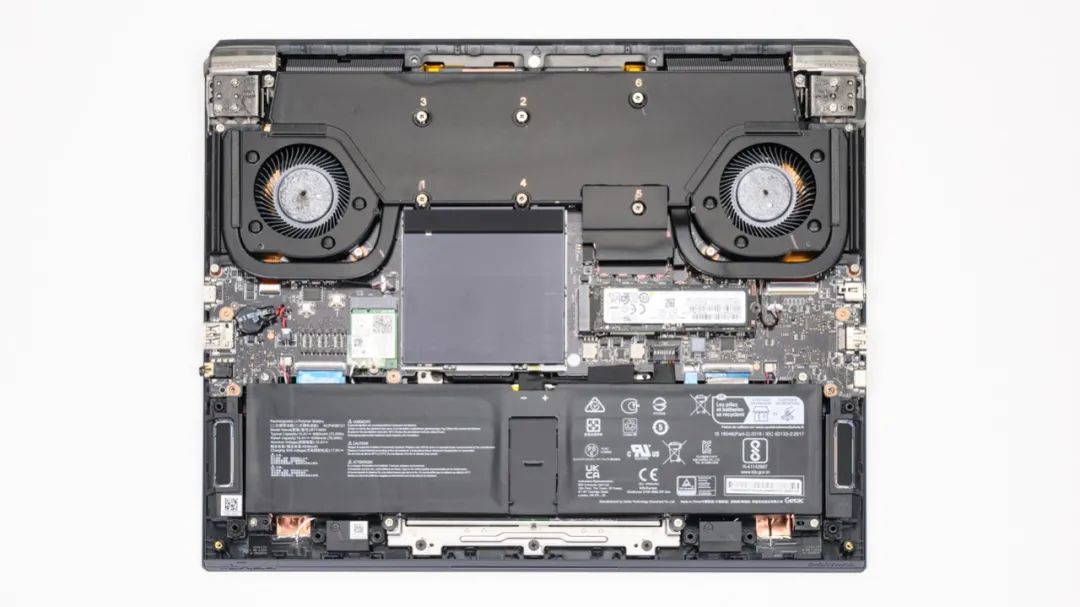 上图是微星 绝影14 AI Studio 2024的拆机实拍图,双风扇加VC均热板的组合。