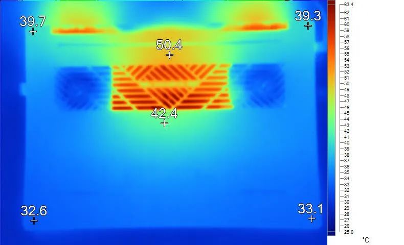 表面温度如上图所示,键盘键帽最高温56.5℃出现在“K”键上,WASD键附近约为38.0℃,方向键33.7℃。左腕托温度为33.5℃。背面中心点42.4℃。