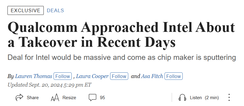 据华尔街日报消息:高通有意收购Intel,两家公司最近已有所接触,但这笔交易并非板上钉钉,Intel目前尚未同意任何此类提议。