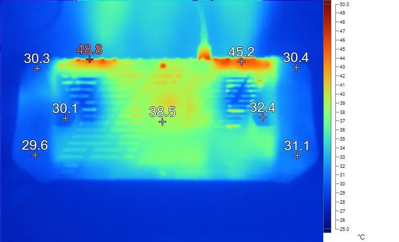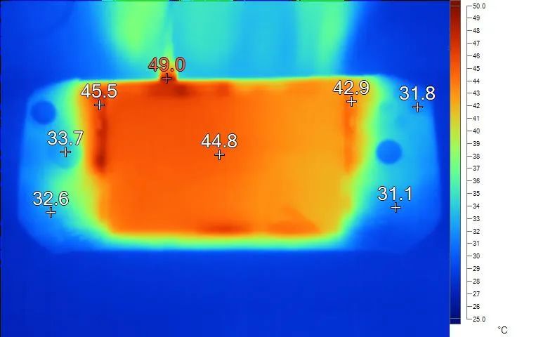 表面温度如上图所示,正面最高温49.0℃在充电口处,屏幕中心为44.8℃,左摇杆为33.7℃。背面中心温度为38.5℃,右手柄握持处为29.6℃。