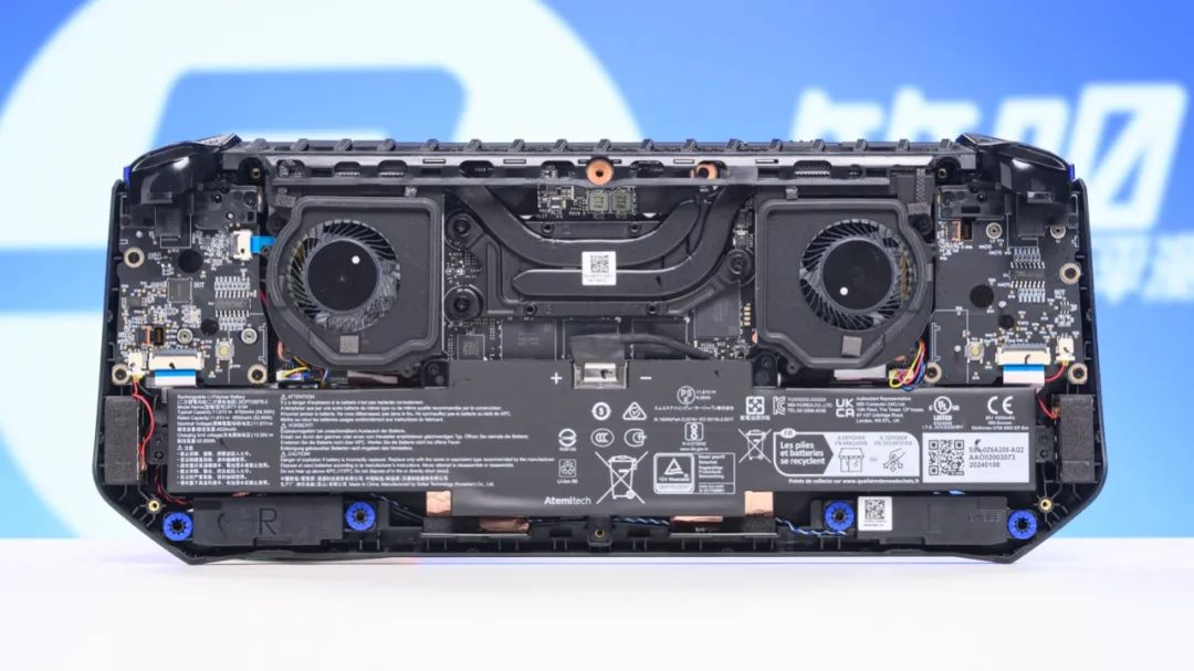 上图是微星 CLAW 掌上游戏机的拆机实拍图,双风扇双热管的组合。
