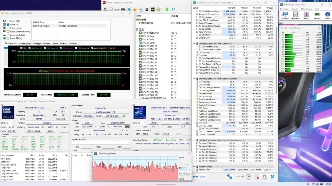 在满载状态下,开启狂暴模式,CPU温度稳定在98℃,功耗略有波动,截图时功耗约43W,P核频率2.5~3.0GHz,E核频率2.2GHz,LPE核频率1.6GHz。