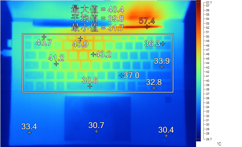 表面温度如上图所示,键盘键帽最高温45.9℃出现在“F6”上,WASD键为41.2℃,方向键32.8℃。左腕托温度为33.4℃,背面中心点37.2℃。