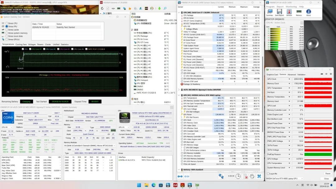 在满载状态下,开启狂暴模式,CPU温度稳定在87℃,功耗40W,P核频率3.0~3.1GHz,E核2.3~2.4GHz;