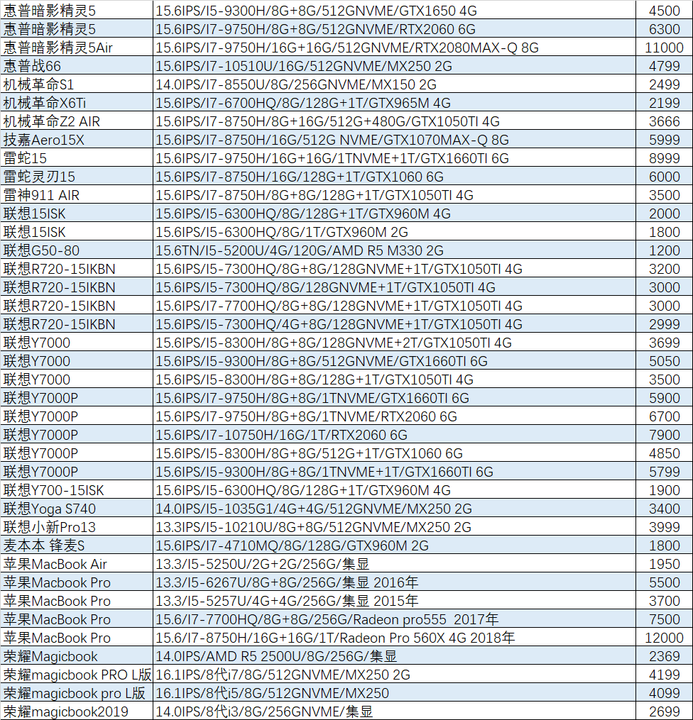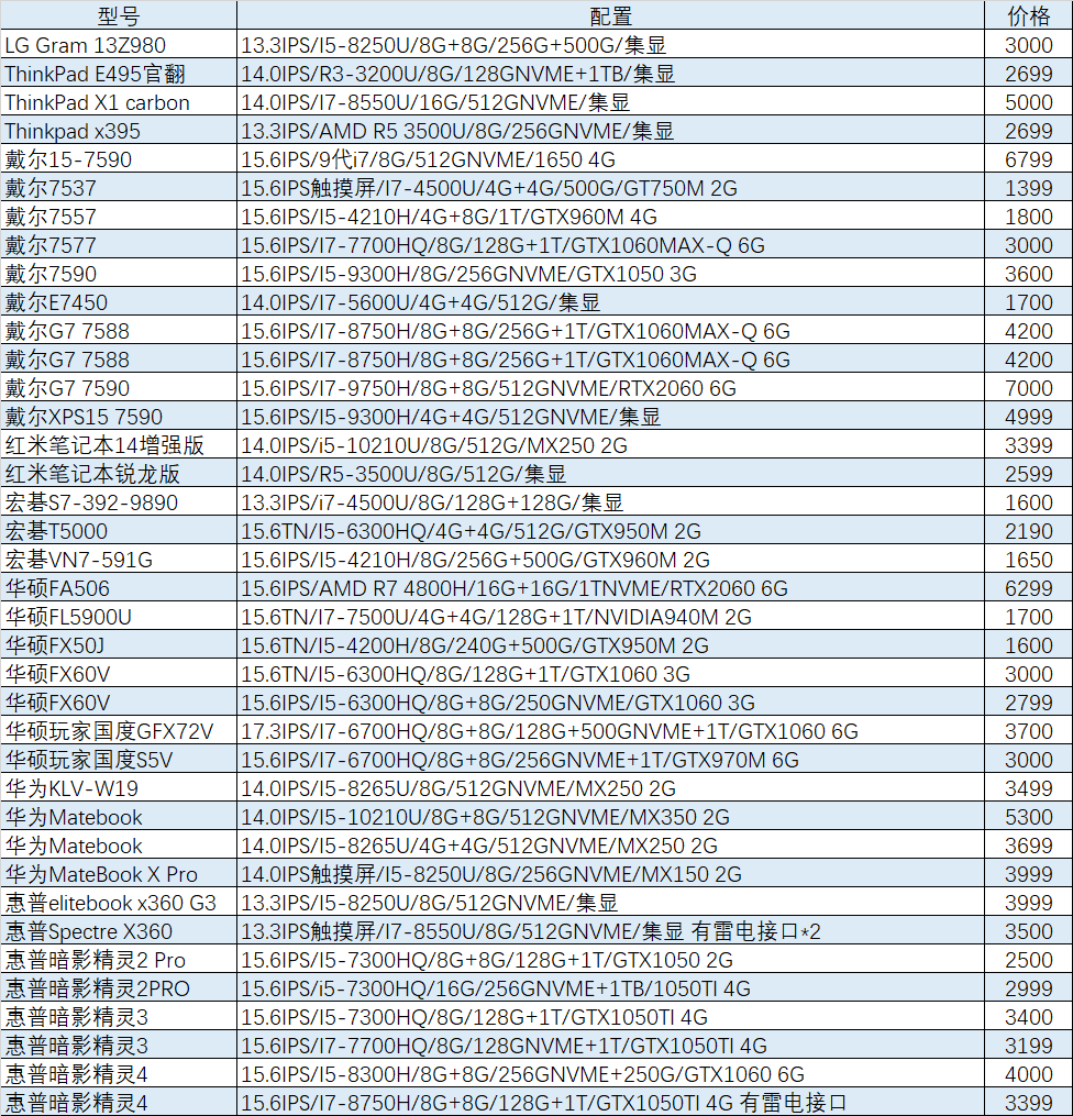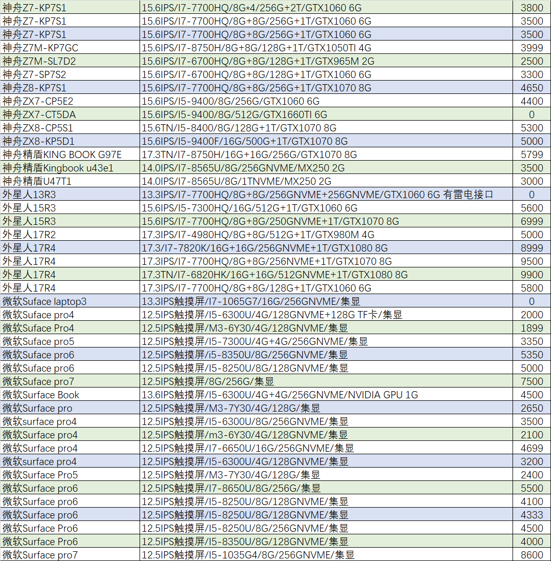 上周已售出机型:(无法列出成色,价格仅供参考)