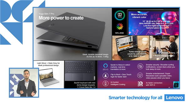 参数方面,Yoga Slim 7、Yoga Slim 7 Pro都会配备TigerLake处理器,至少有一款i7-1165G7,该处理器规格为4c8t,频率2.8-4.7GHz,集成Iris Xe核显显卡方面则有NVIDIA GTX 1650或者MX450可供选择