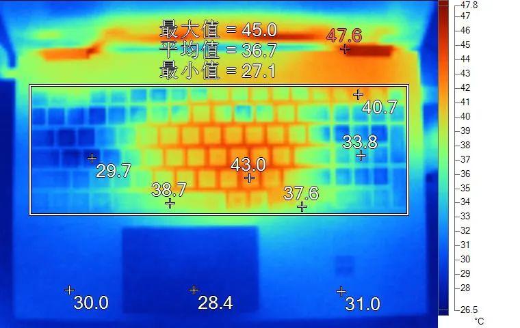 表面温度如上图所示,键盘键帽温度最高为43℃,WASD键位区域在30℃附近,方向键37.6℃。左腕托温度为30℃。