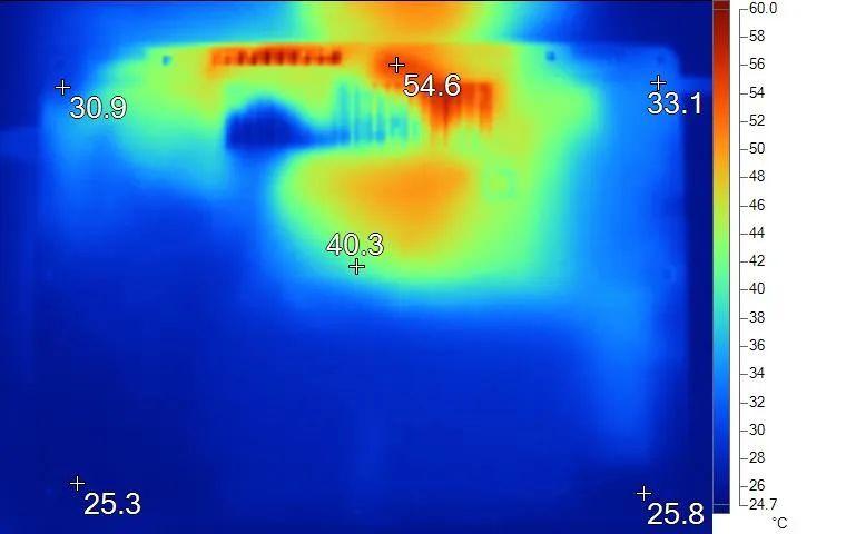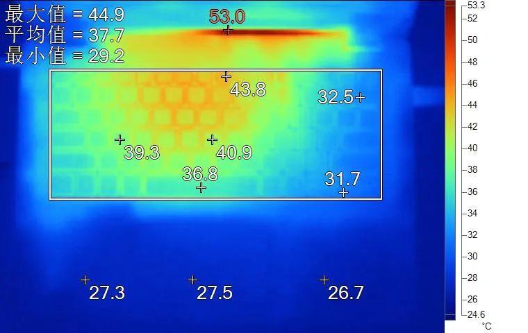 背面温度如上图所示,最高温度约54.6℃,中心点温度40.3℃。