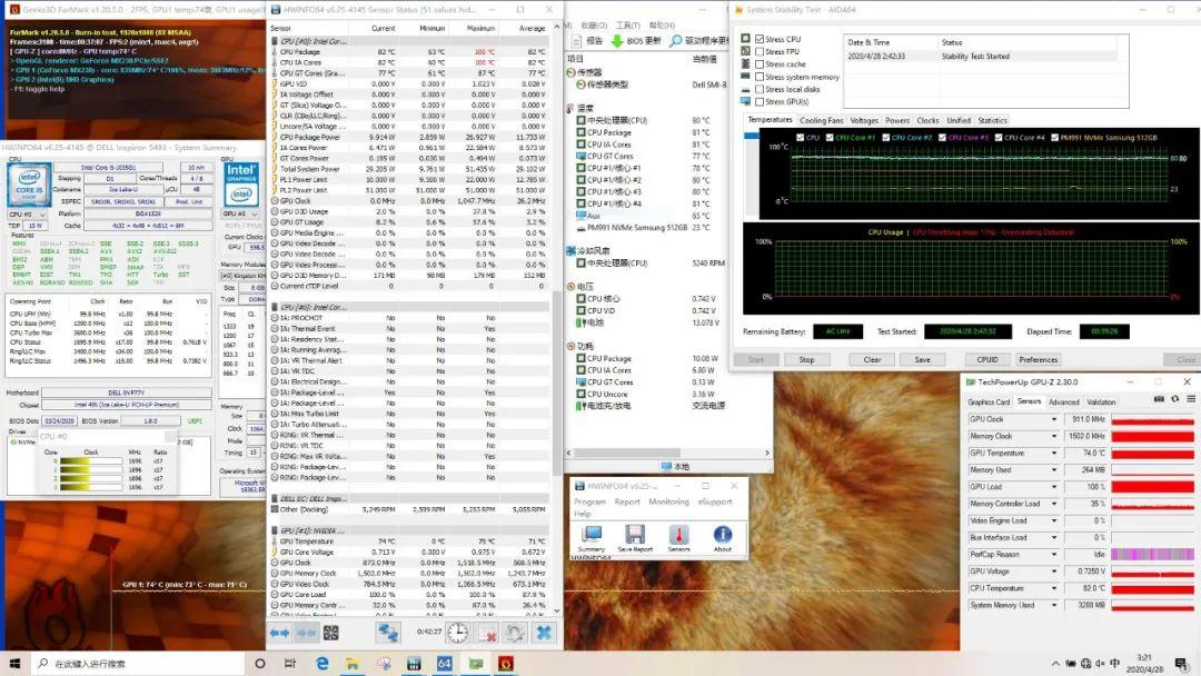针对轻薄本,我们使用负载较低的Stress CPU+Furmark进行压力测试。