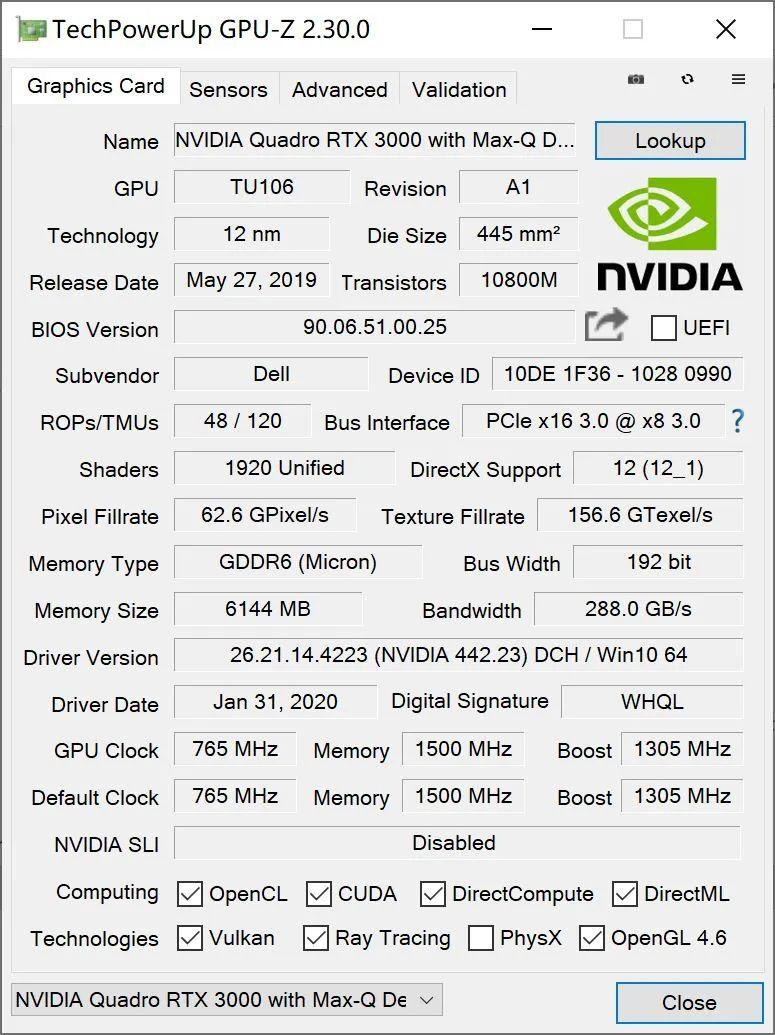 显卡参数如上图所示,是RTX2060 Max-Q的“专业版本”,但核心频率比较低,显存频率高了125MHz,功耗一样是65W。