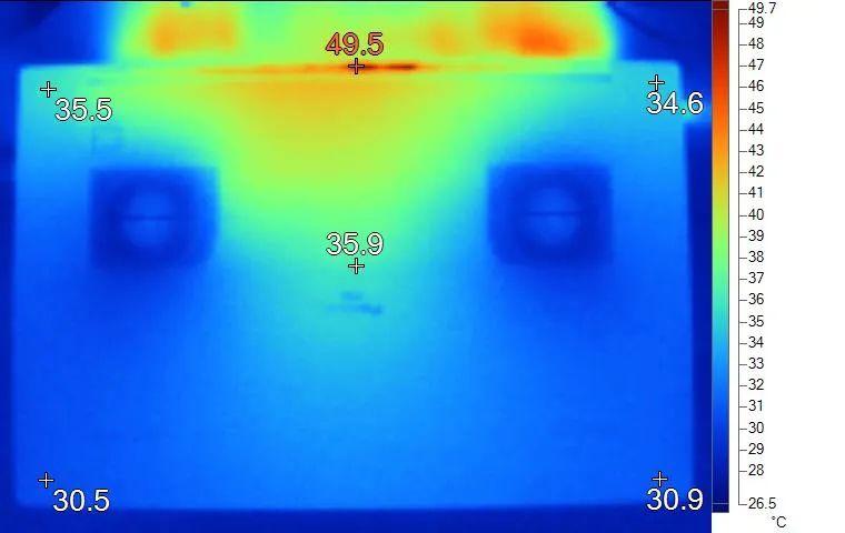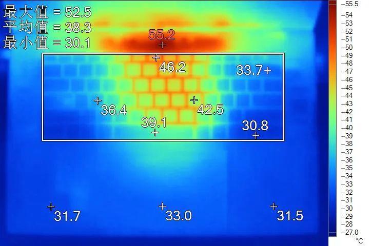 表面温度如上图所示,键盘键帽温度最高为46.2℃,WASD键位区域在36℃附近,方向键30.8℃。左腕托温度为31.7℃。