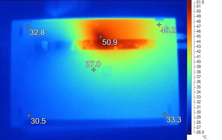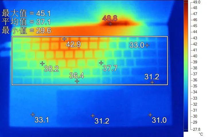 表面温度如上图所示,键盘键帽温度最高为42.9℃,WASD键位区域在38℃附近,方向键31.2℃,左腕托33.1℃,背面中心点37℃。